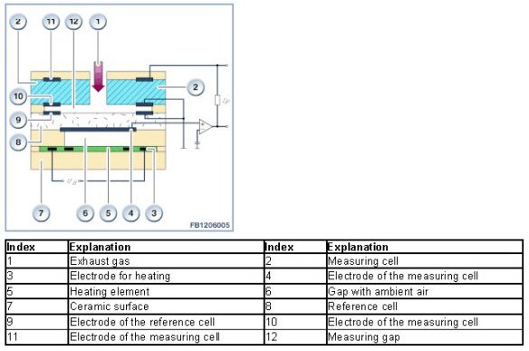 The oxygen sensor consists of a ceramic coating made of zirconium dioxide (laminated). The heating element inserted in the laminate rapidly ensures the required operating temperature of at least 750 °C. The oxygen sensor contains 2 cells, a measuring cell and a reference cell. The two cells are coated with electrode made of platinum.