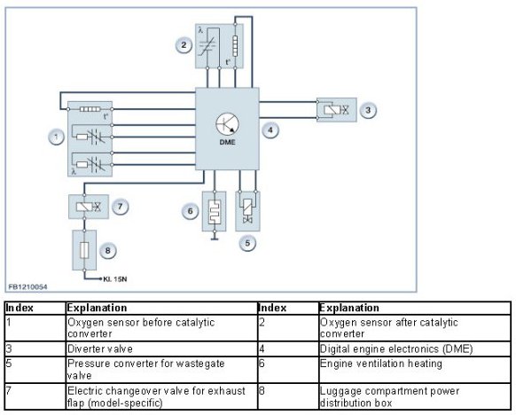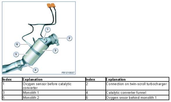 The 6-cylinder spark ignition N55 engine complies with EURO 5 emissions standards. Two oxygen sensors are installed to support the lambda closed-loop emissions control. One oxygen sensor serves as the control sensor and is mounted between the engine and the near-engine catalytic converter. The second oxygen sensor serves as a monitoring sensor in the near engine catalyst (between monolith 1 and monolith 2).