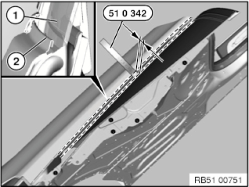 Determine the cavity gap using special tool 51 0 342 from rear side window (1) horizontally to the inner edge of flare flange (2) along the entire cavity length.