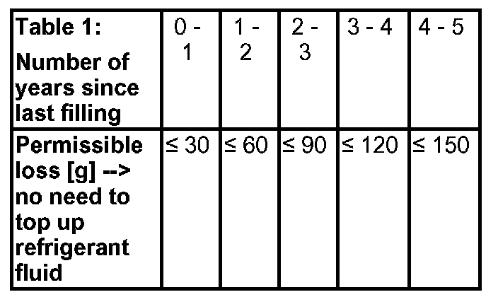 Table 1 indicates the permitted loss of refrigerant after a specific period of time. There is no leak. Refrigerant fluid may not be topped up.