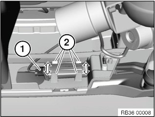 Press retaining tabs (2) apart as indicated by arrow.