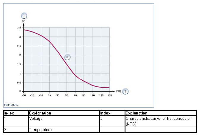 The electrical voltage at the resistor is dependent on the coolant temperature. A table that specifies the temperature associated with each voltage value is stored in the engine control. This compensates for the nonlinear relationship between electrical voltage and temperature.