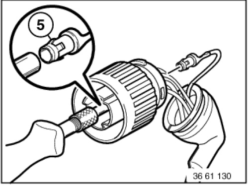 Use special tool 61 0 303 (61 1 132) to press back retaining hook (5) of corresponding contact and pull out cable with contact