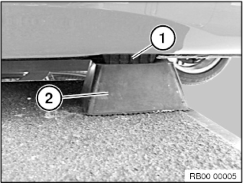 Align the rubber block (2) with the jacking points (1) in such a way that no adjoining components are touched and thereby damaged.