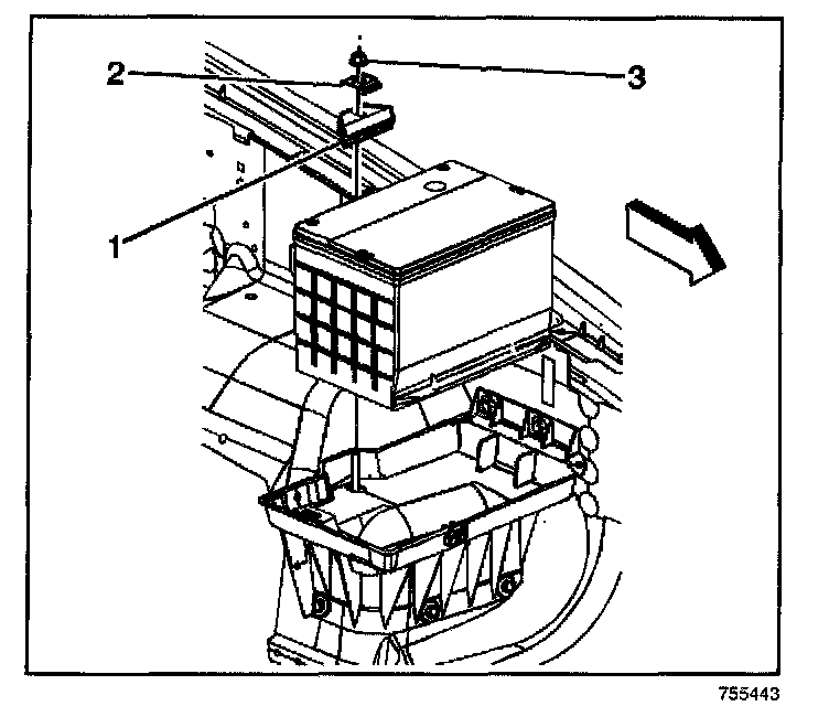 2. Install the battery hold down retainer (1), nut (3), and washer.