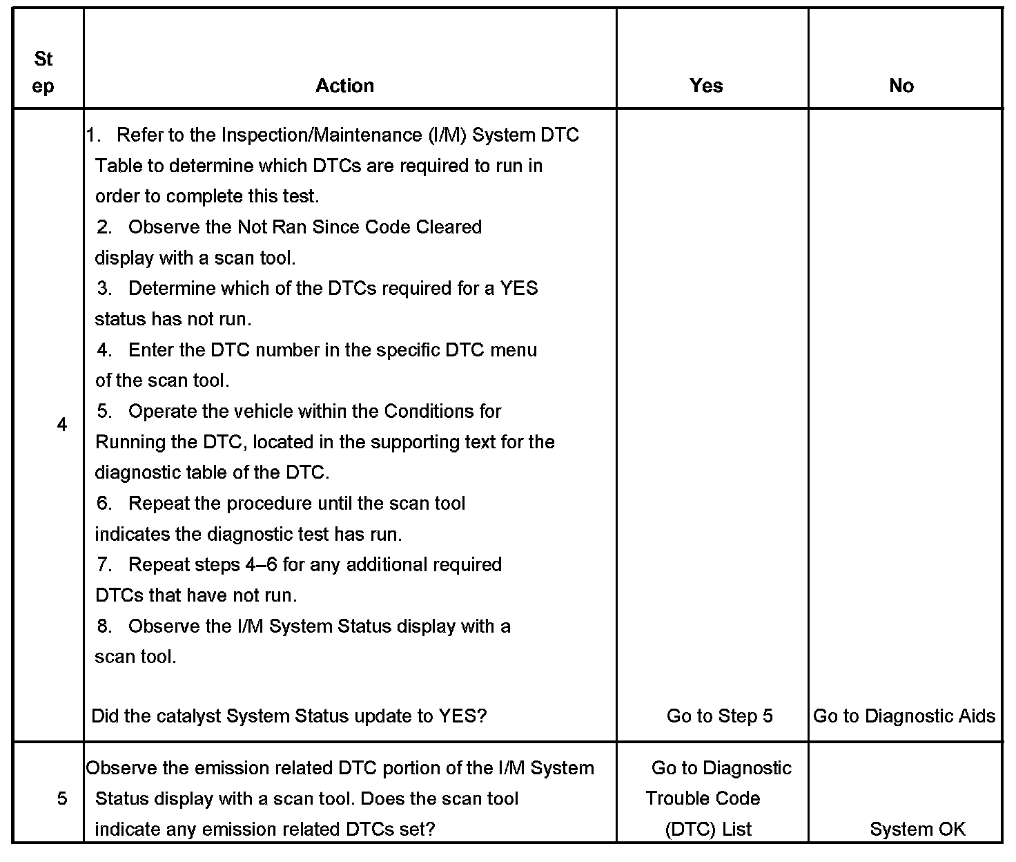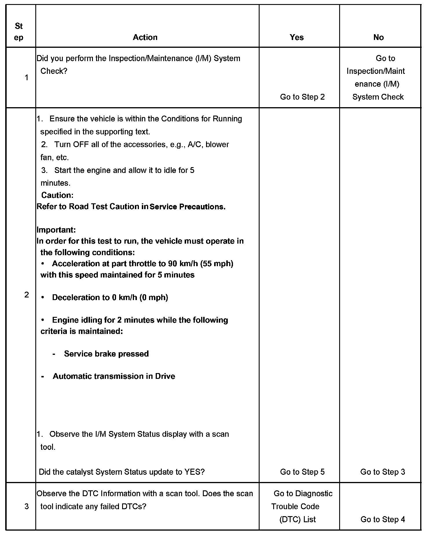 The purpose of this test is to satisfy the enable criteria necessary to execute inspection/maintenance (I/M) readiness diagnostics for the catalyst system. The test may be used to set the I/M System Status indicators to YES. The I/M System Status display on the scan tool provides an indication of whether the control module has completed the required tests. The I/M System Status does not indicate that the tests have passed or failed. When all of the diagnostics for a specific system have run and passed, the I/M System Status will update to YES. If a test for a specific system has failed, the I/M System Status will update to YES, indicating a determination was made even if all of the other tests for that system have not run.