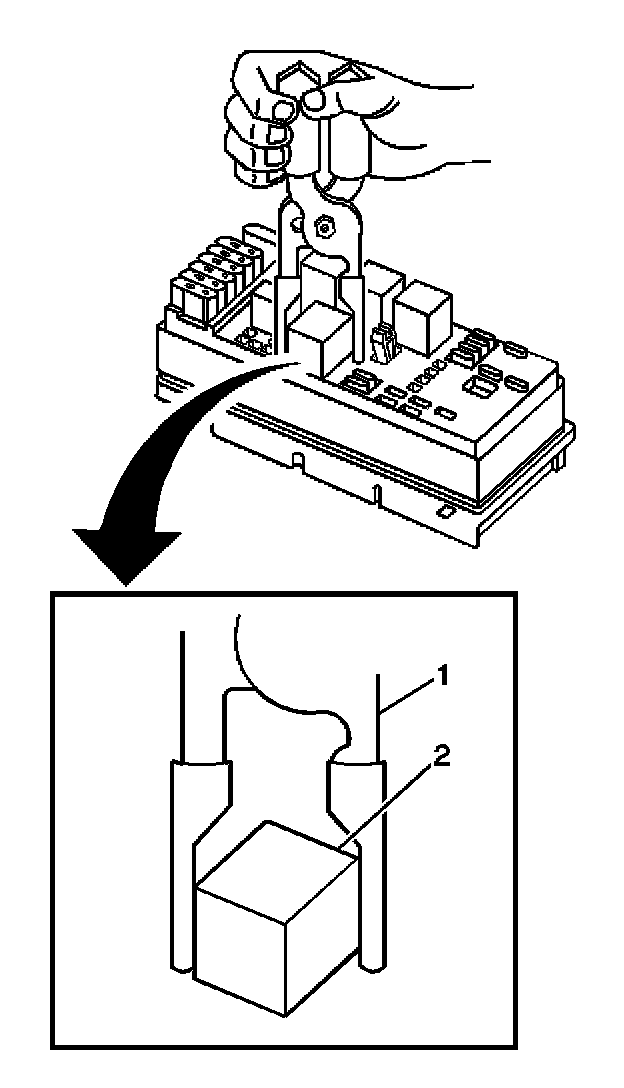 NOTE: Use J43244 to pull the relay straight out from the electrical center terminals. The use of pliers or a flat bladed tool could damage the electrical center.