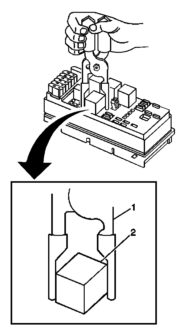 1. Using the J 43244 (1) position the tool on opposing corners of the compressor relay (2).