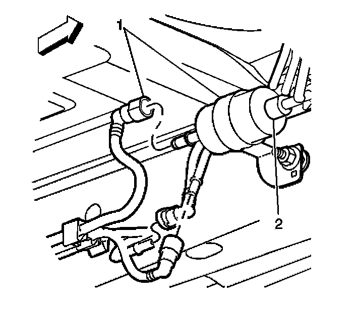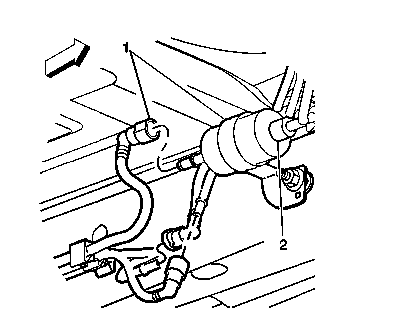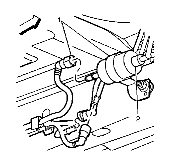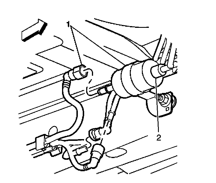 6. Remove the quick-connect fitting (2) at the outlet of the in-pipe fuel filter.