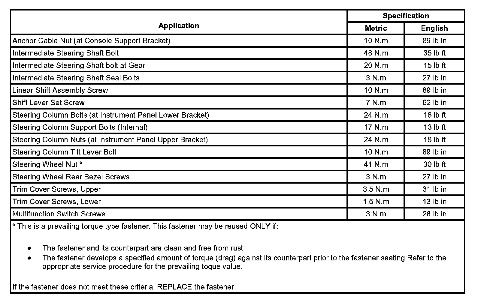Fastener Tightening Specifications:
