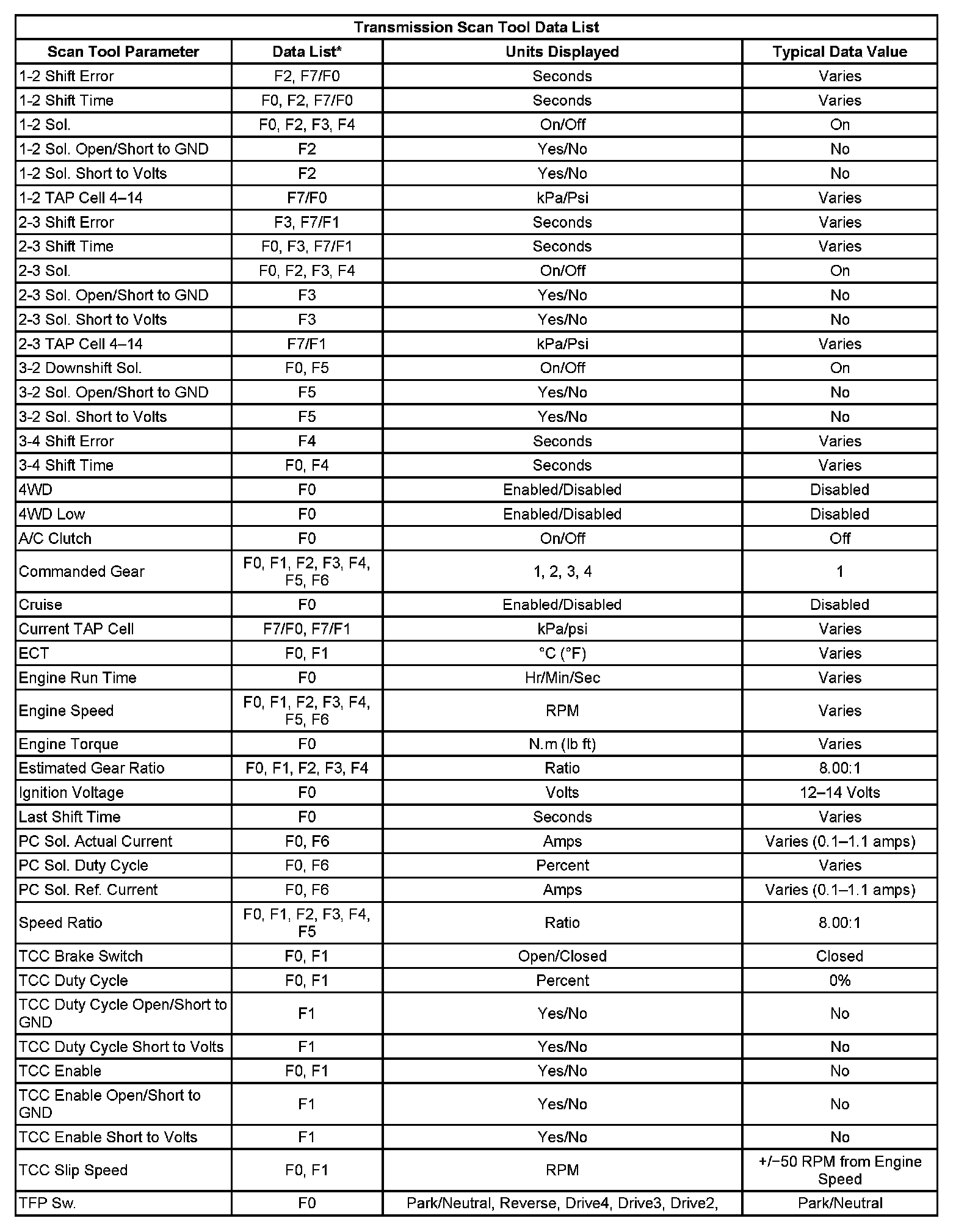 Only the parameters listed below are used for diagnosing. If a scan tool displays other parameters, the values are not recommended by General Motors for use in diagnosis.