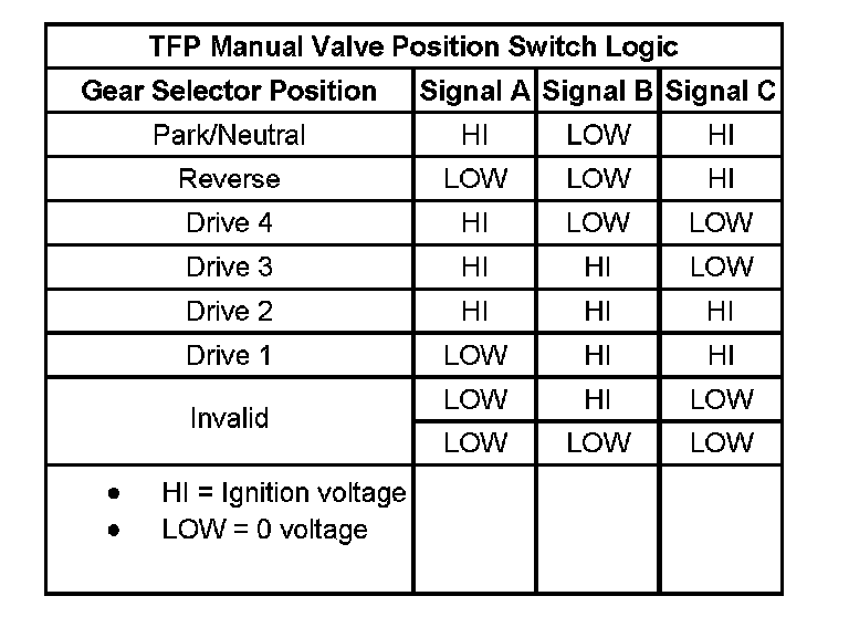 Transmission Fluid Pressure (TFP) Manual Valve Position Switch Logic: