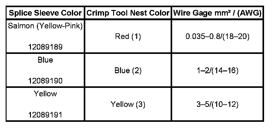 5. Use the Splice Crimp Tool from the J 38125-D to crimp splice sleeve. In order to position the splice sleeve in the proper color nest of the Splice Crimp Tool, refer to the table at the beginning of this repair procedure.