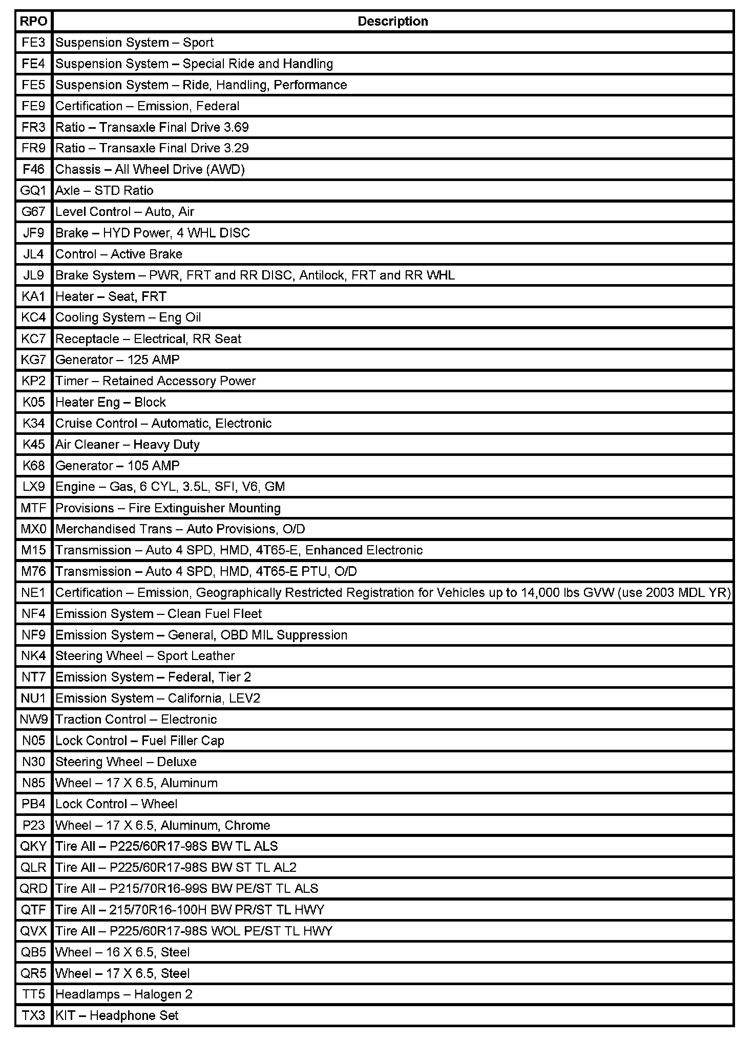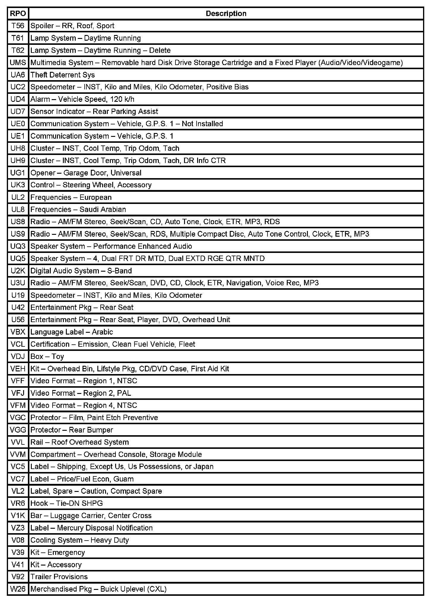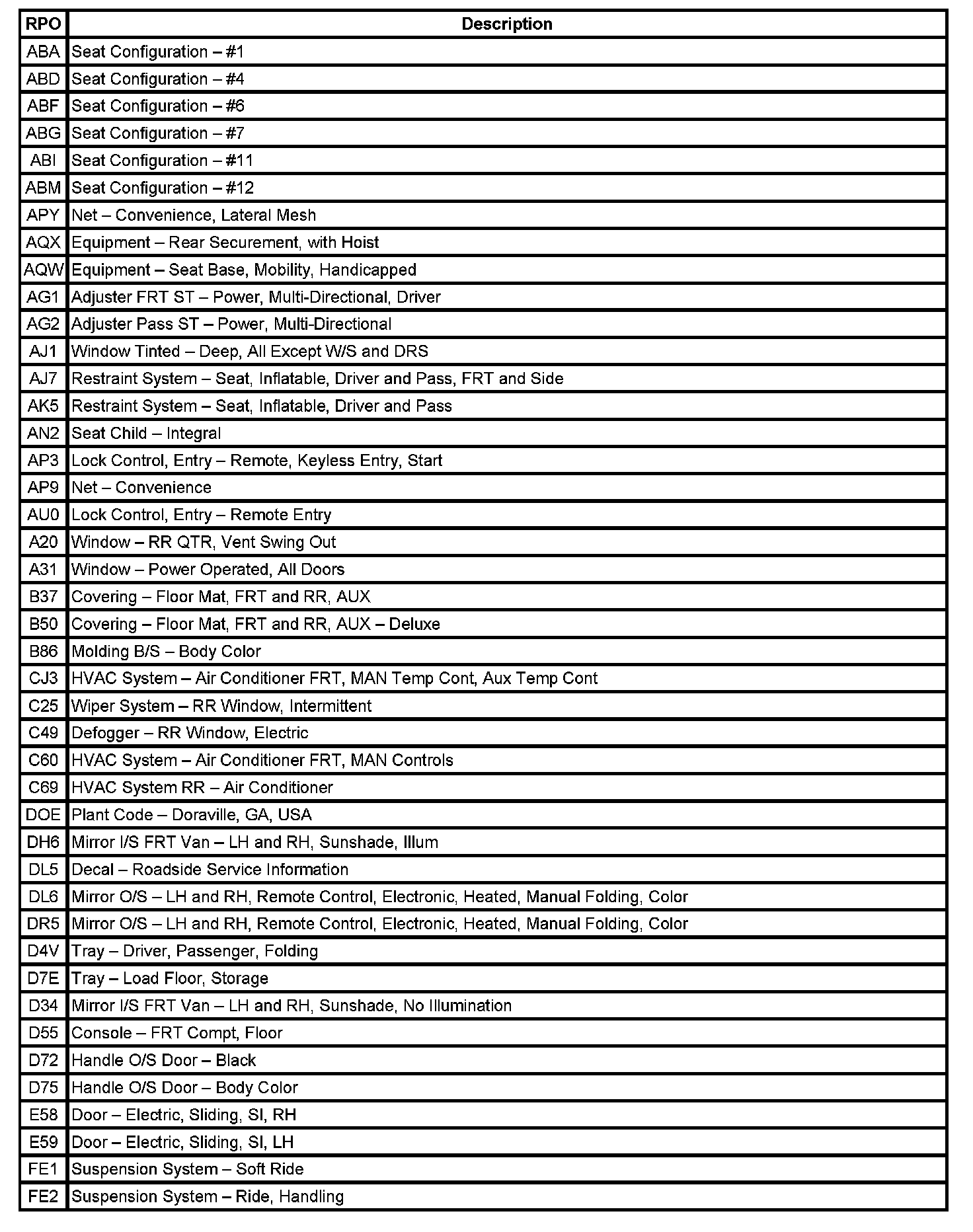 RPO Code List (Part 1):