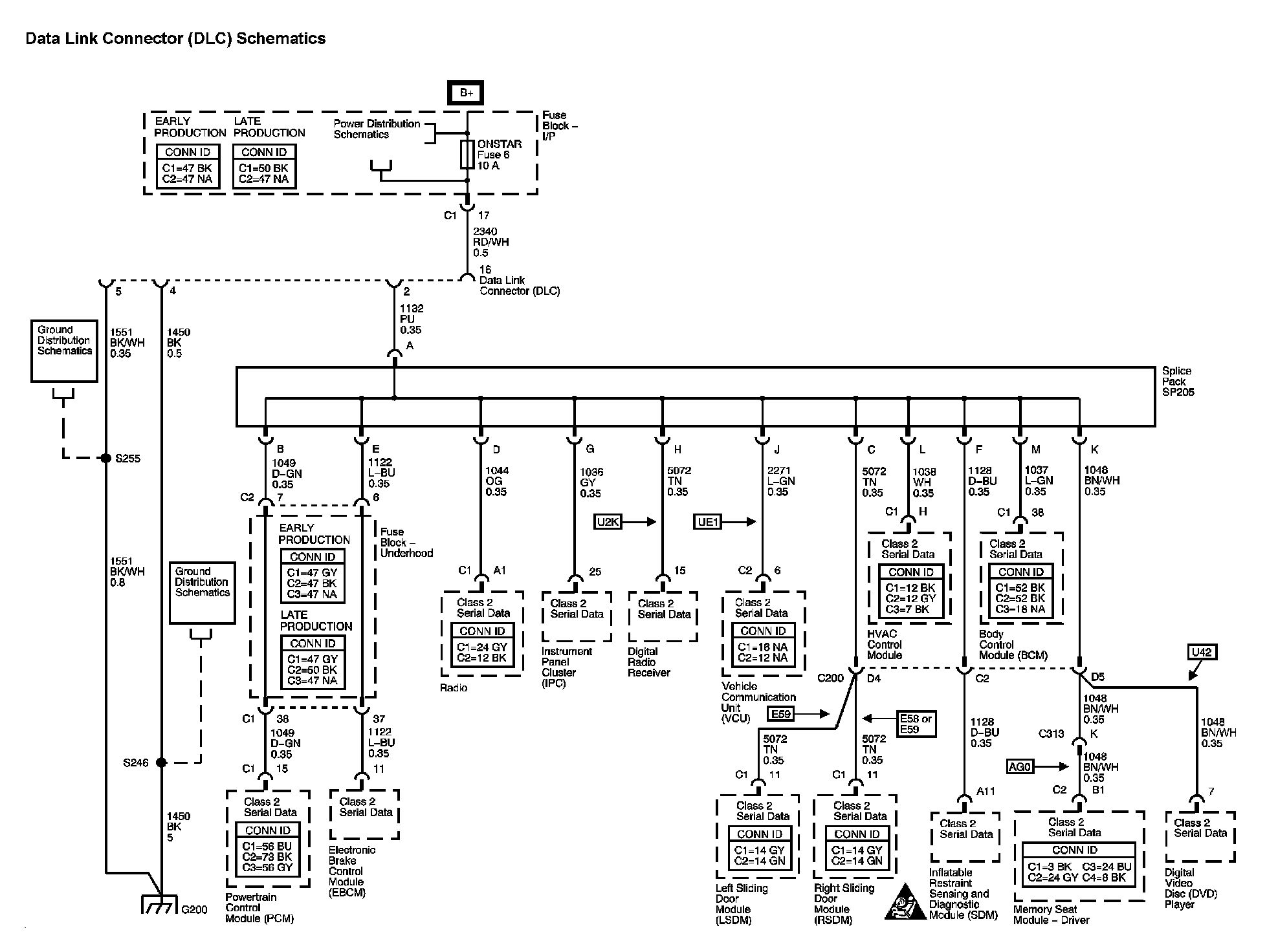 The locations for the Connectors, Grounds, Splices, and Grommets shown within these diagrams can be found via their at Vehicle Locations.