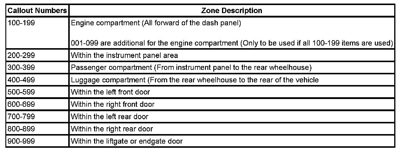 All grounds, in-line connectors, pass-through grommets, and splices have identifying numbers that correspond to where they are located in the vehicle. The following table explains the numbering system.