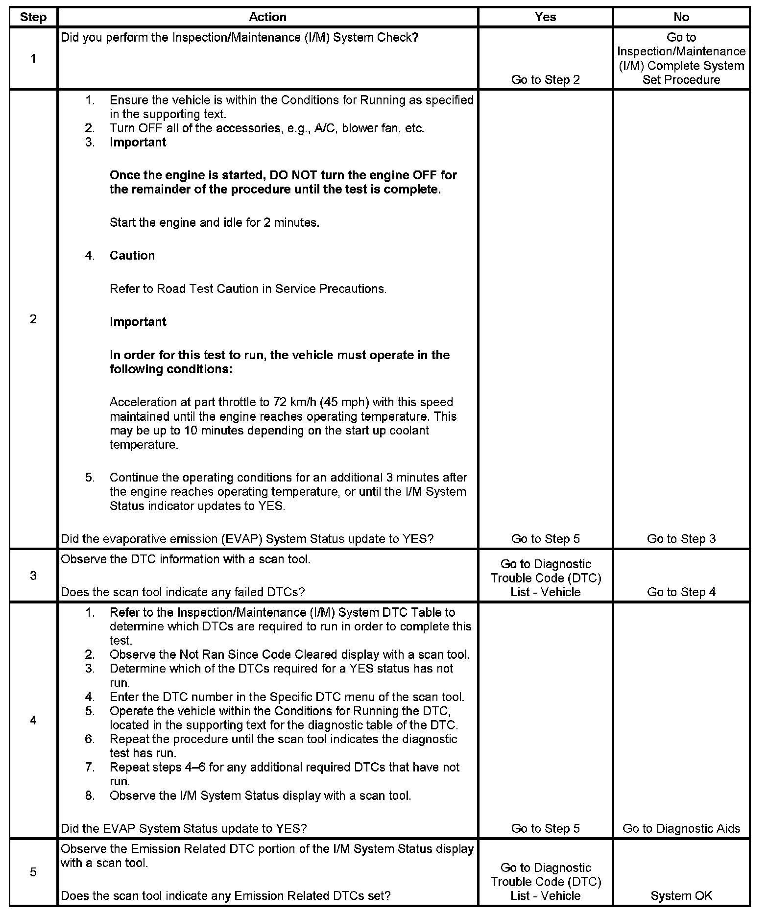 The purpose of this test is to satisfy the enable criteria necessary to execute inspection/maintenance (I/M) readiness diagnostics for the evaporative emission (EVAP) system. The test may be used to set the I/M System Status indicators to YES. The I/M System Status display on the scan tool provides an indication of when the control module has completed the required tests. The I/M System Status does not indicate that the tests have passed or failed. When all of the diagnostics for a specific system have run and passed, the I/M System Status will update to YES. If a test for a specific system has failed, the I/M System Status will update to YES, indicating a determination was made, even if all of the other tests for that system have not run. Performing a visual inspection prior to running the EVAP test may prevent having to repeat the test. A failed or aborted test will require the vehicle to cool down in order to meet the enable criteria to run another test.