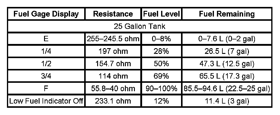 The information in this table is intended for use with the J 33431-C Signal Generator and Instrument Panel Tester. The fuel level sensor values represent the test values to be used on the Signal Generator to drive the fuel gage display to the indicated positions. Vehicles that require more than one fuel level sensor calculate gage position from many possible resistance combinations of fuel levels between the two tanks. Therefore, the values in the table may not correlate directly to readings taken from the vehicle primary or secondary sending units.