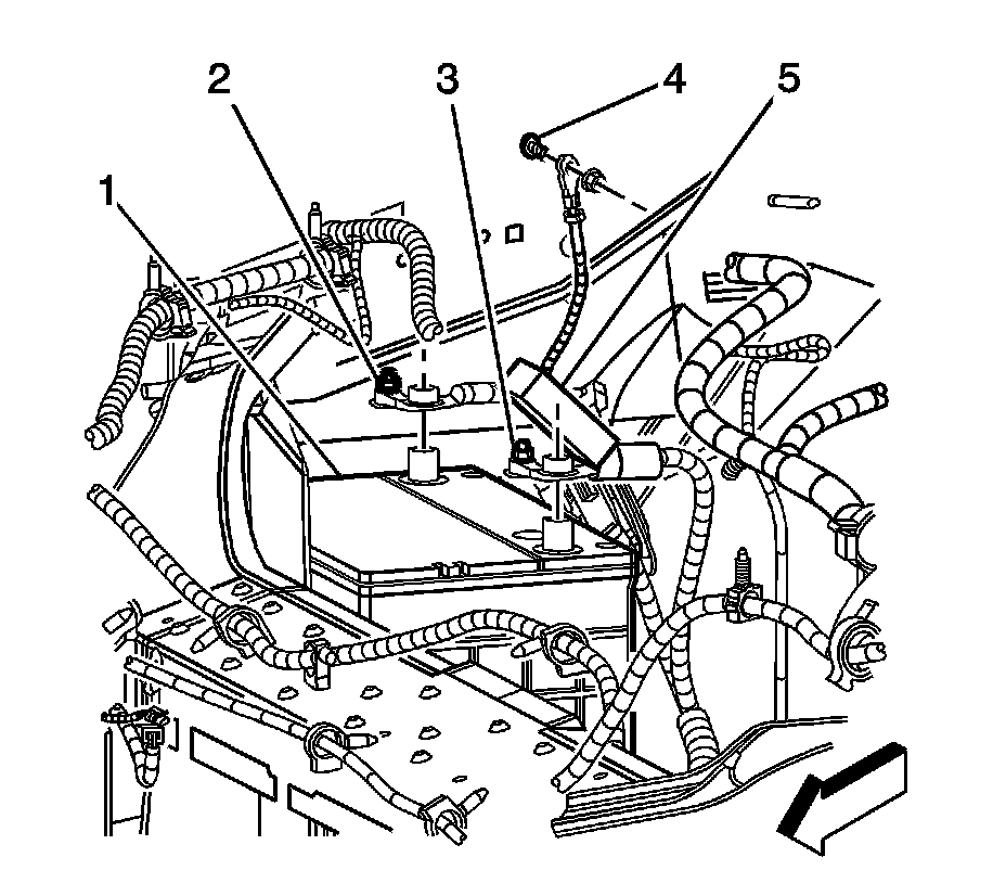 5. Remove the battery hold down retainer bolt (3).
