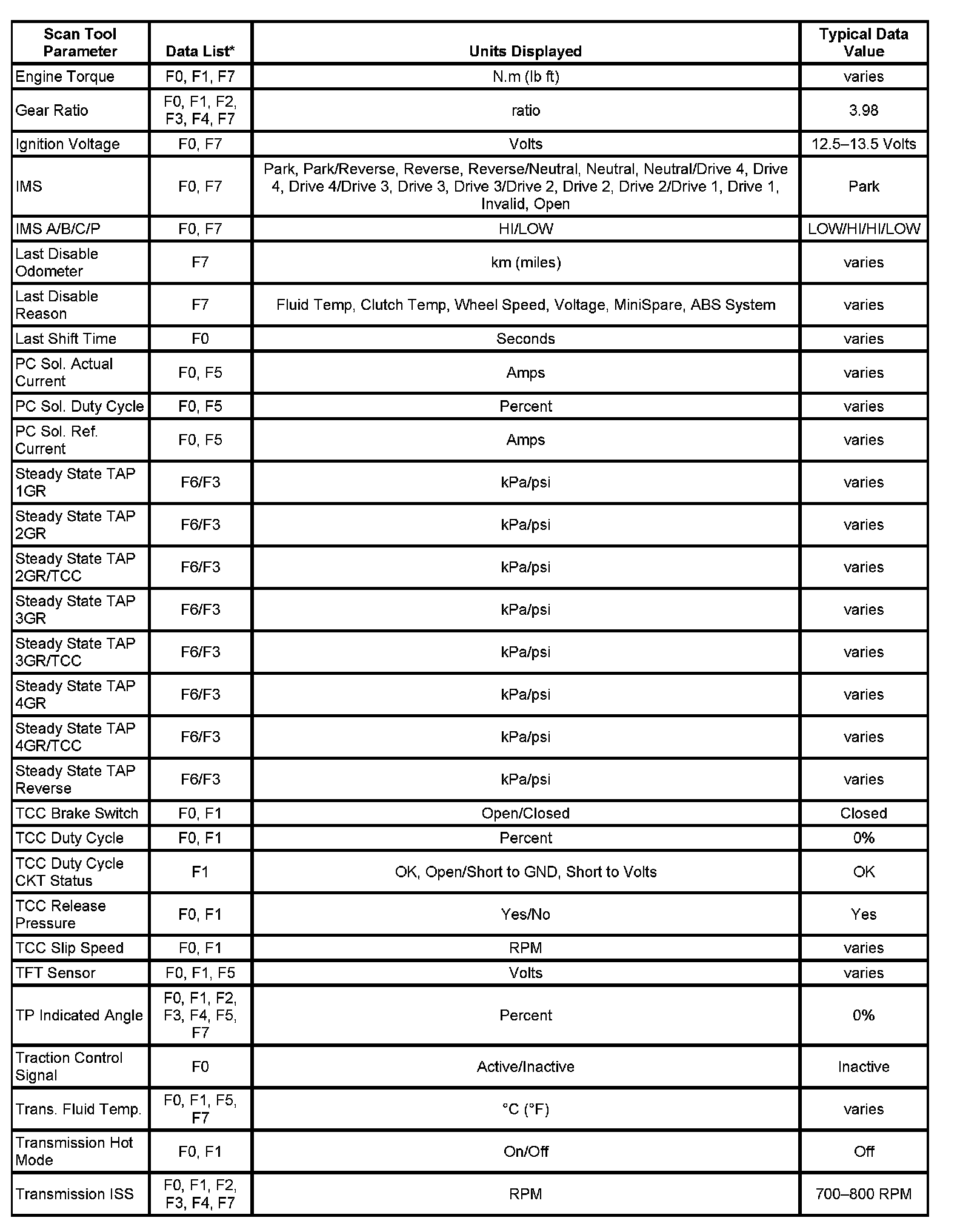 Only the parameters listed below are used in this manual for diagnosing. If a scan tool displays other parameters, the values are not recommended by General Motors for use in diagnosis.