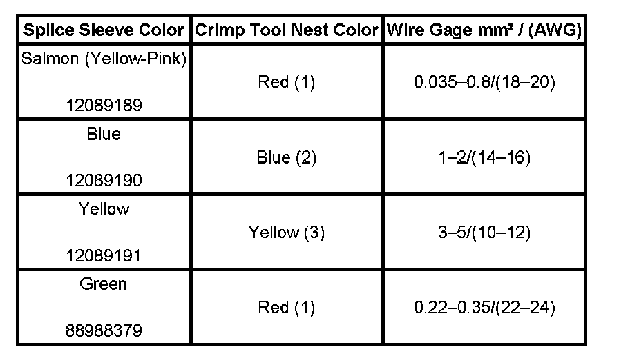 4. Select the proper DuraSeal splice sleeve according to the wire size. Refer to the above table at the beginning of the repair procedure for the color coding of the DuraSeal splice sleeves and the crimp tool nests.