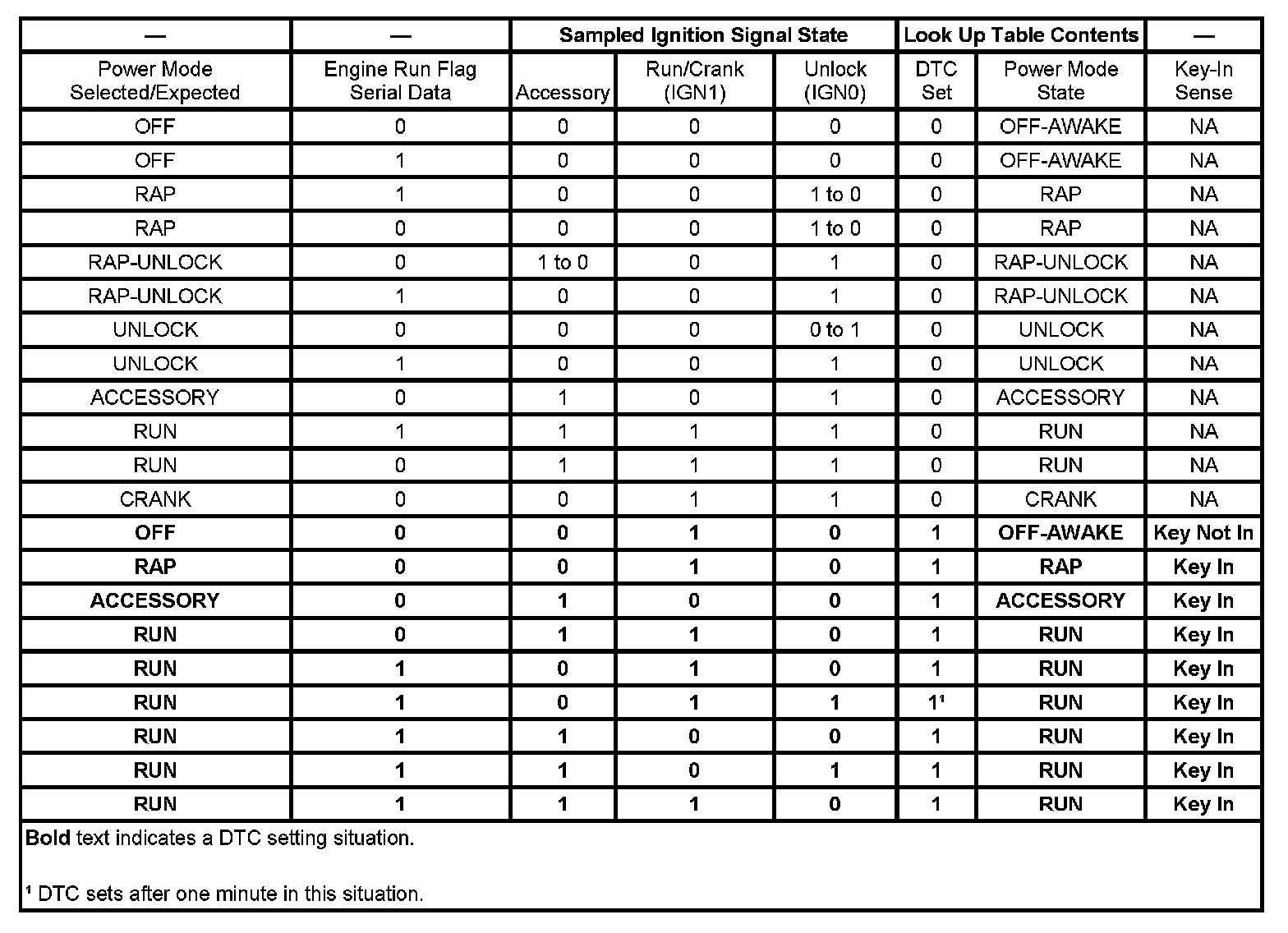 The modules that depend exclusively on serial data messages for power modes stay in the state dictated by the last valid PMM message until they can check for the engine run flag status on the serial data circuits. If the PMM fails, the modules monitor the serial data circuit for the engine run flag serial data. If the engine run flag serial data is True, indicating that the engine is running, the modules fail-safe to RUN. In this state the modules and their subsystems can support all operator requirements. If the engine run flag serial data is False, indicating that the engine is not running, the modules fail-safe to OFF-AWAKE. In this state the modules are constantly checking for a change status message on the serial data circuits and can respond to both local inputs and serial data inputs from other modules on the vehicle.