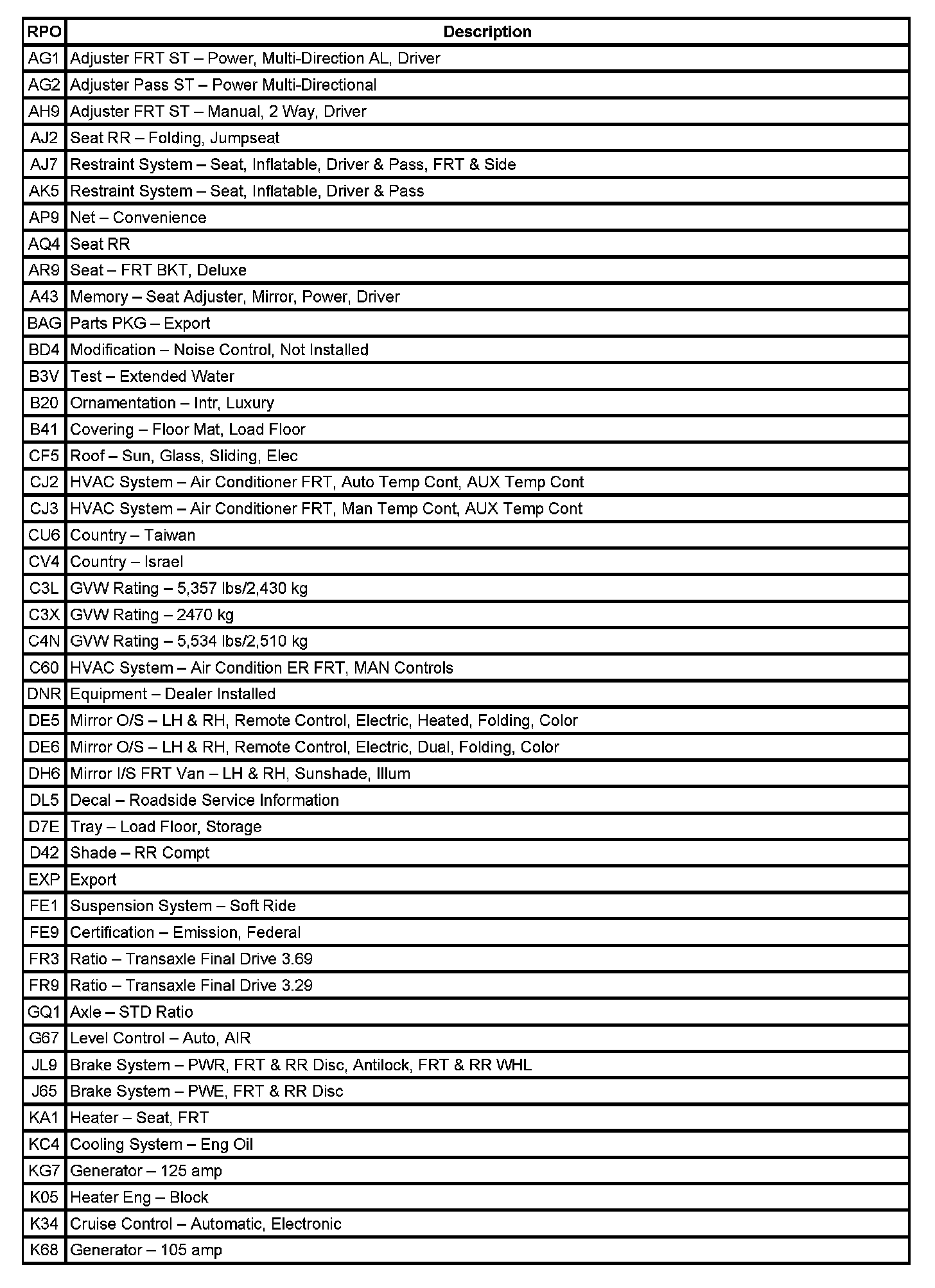 RPO Code List (Part 1):