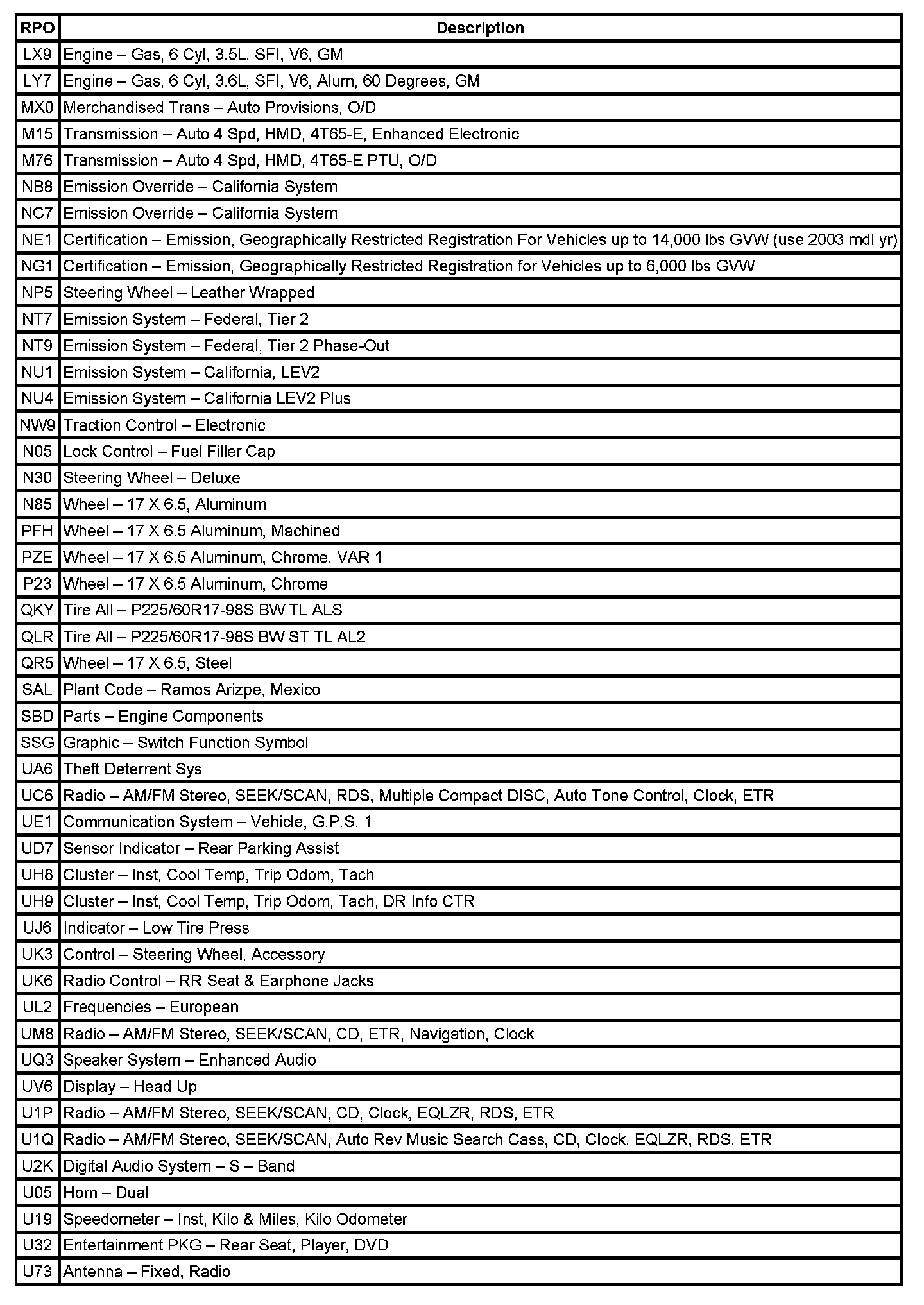 The table provides the description of the Regular Production Option (RPO) codes that are available on the vehicle. The vehicle's RPO list is printed on the Service Parts Identification Label.