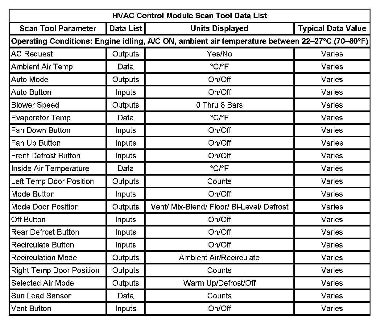 HVAC Control Module Scan Tool Data List: