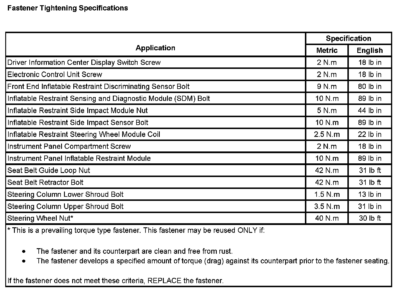 Fastener Tightening Specifications: