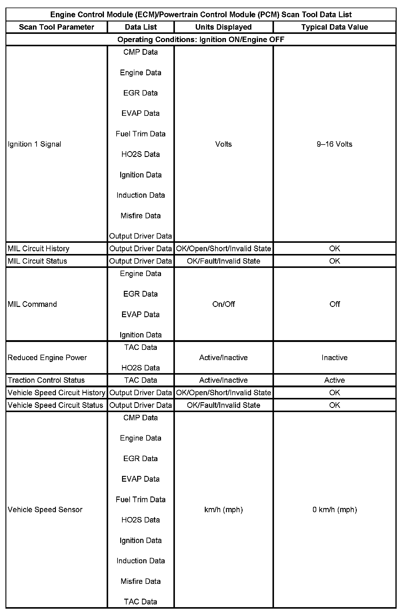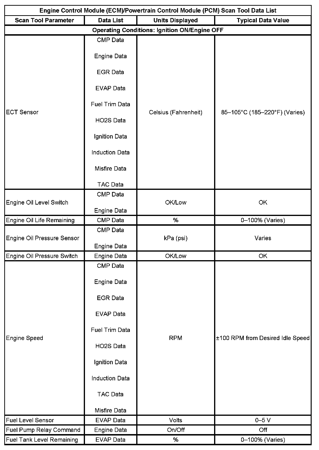 Engine Control Module (ECM)/Powertrain Control Module (PCM) Scan Tool Data List (Part 1):