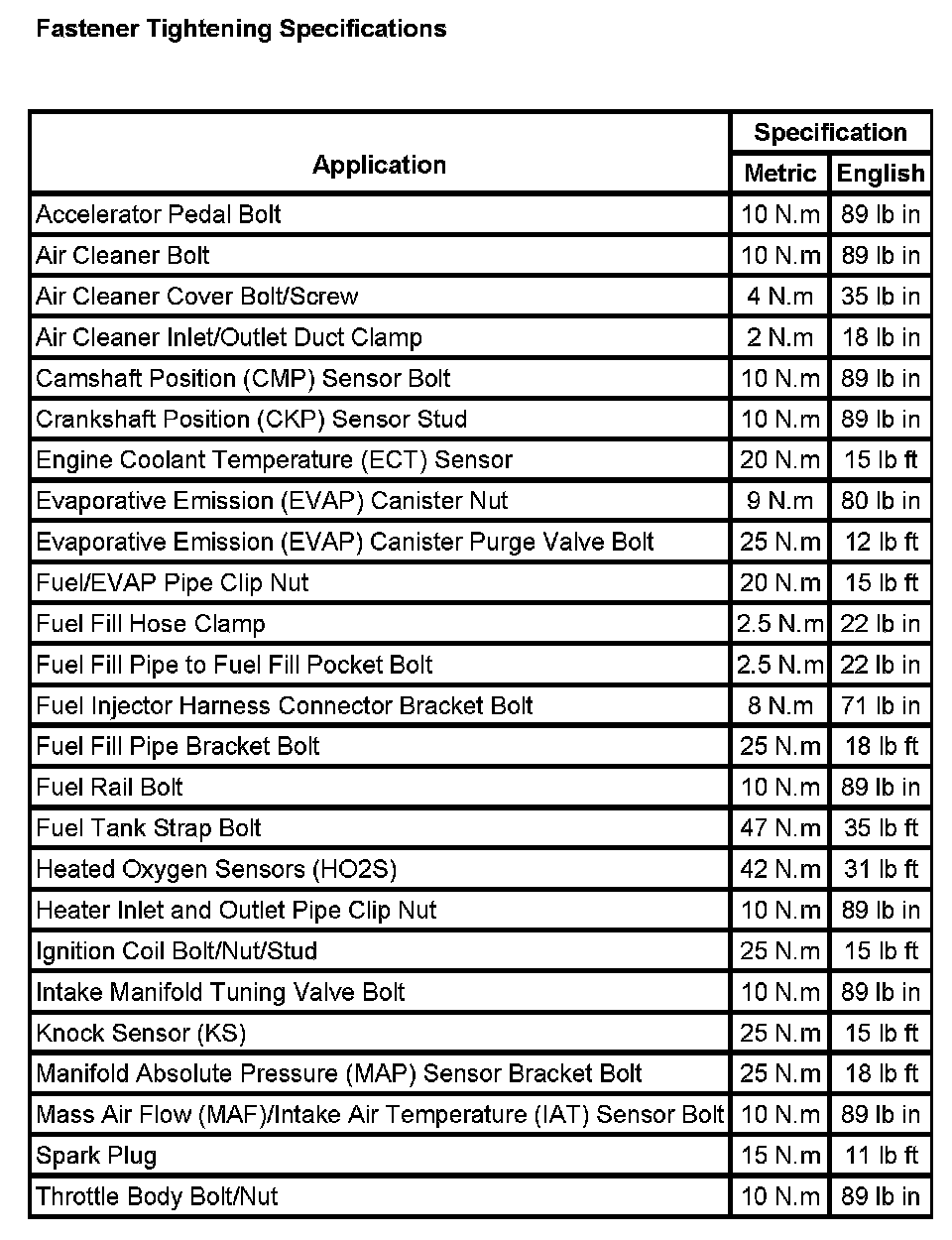 Fastener Tightening Specifications:
