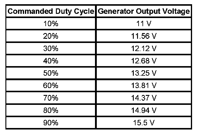 The engine control module (ECM) controls the generator through the generator field control circuit. It monitors the generator performance through the generator field duty cycle signal circuit. The signal is a pulse width modulated (PWM) signal of 128 Hz with a duty cycle of 0-100 percent. Normal duty cycle is between 5-95 percent. Between 0-5 percent and 95-100 percent are for diagnostic purposes. The following table shows the commanded duty cycle and output voltage of the generator: