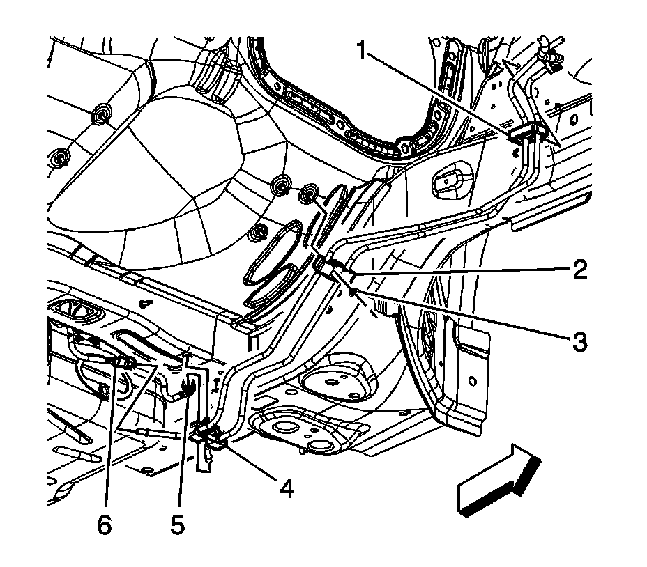 4. Connect the EVAP canister vent front pipe quick connect fitting (5) to the chassis EVAP pipe.