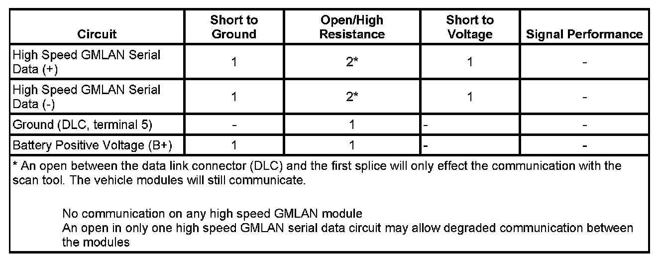 - Any of the high speed GMLAN serial data circuits shorted to ground or voltage