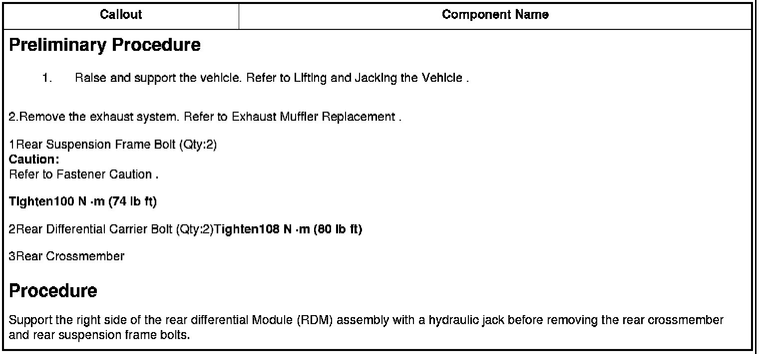 Support the right side of the rear differential Module (RDM) assembly with a hydraulic jack before removing the rear crossmember and rear suspension frame bolts.