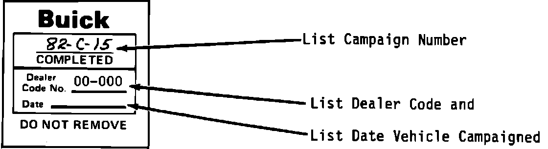 Each vehicle modified in accordance with the instructions outlined herein will require a Campaign Identification Label. Each label provides a space to include the campaign number, the five (5) digit dealer code of the dealer performing the campaign service, and the date vehicle was campaigned. This information may be inserted with a typewriter or ballpoint pen. When installing label, clean the surface of the fan shroud and apply the campaign label.