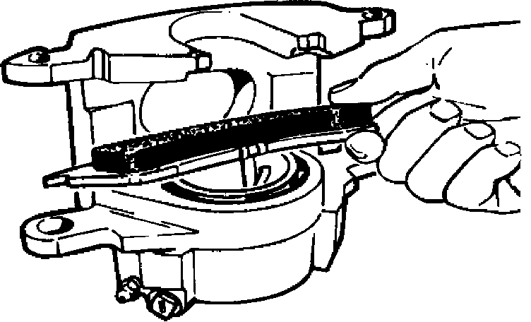 6. With shoes installed, lift caliper and rest bottom edge of outboard lining on outer edge of brake disc to be sure there is no clearance between outboard shoe tab and caliper abutment.