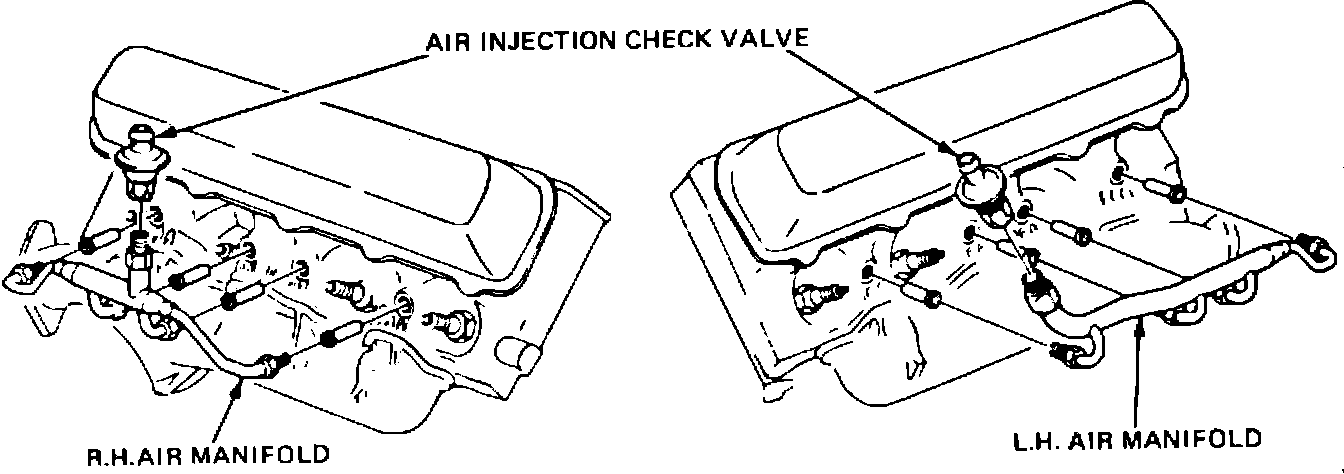 B. Remove A.I.R. hose at left or right air manifold check valve and remove check valve. See Figure 1. When removing check valve, two (2) wrenches must be used to avoid twisting off air manifold pipe.