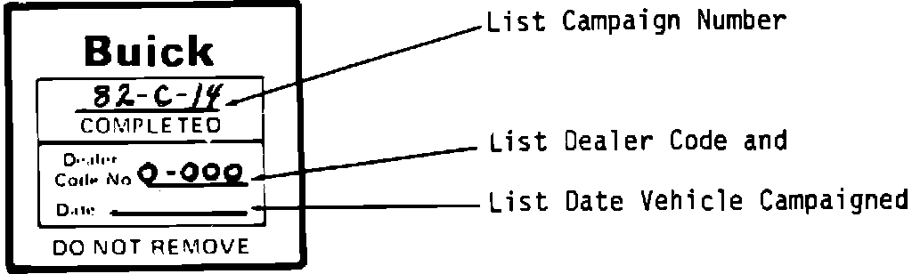 15. Install a Campaign Identification label. Each vehicle modified in accordance with the instructions outlined in this Service Procedure will require a Campaign Identification label. Each label provides a space to include the campaign number, the five (5) digit dealer code of the dealer performing the campaign service, and the date vehicle was campaigned. This information may be inserted with a typewriter or ballpoint pen. When installing label, clean the surface of the radiator upper mounting support and apply the campaign label where it is readily visible.