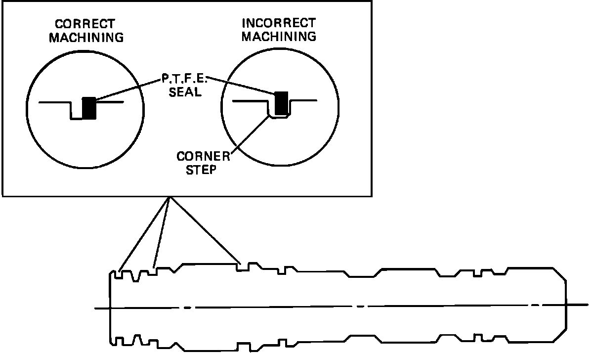 1. An incorrectly machined seal groove on the turbine shaft in the transmission. A step in the bottom corners of the seal groove (Fig. 1) will prevent the turbine shaft seal from contacting the side wall of the groove, and will not seal. If this condition is found, replace the turbine shaft, and seals. Follow service manual procedures for installing and sizing the seals.
