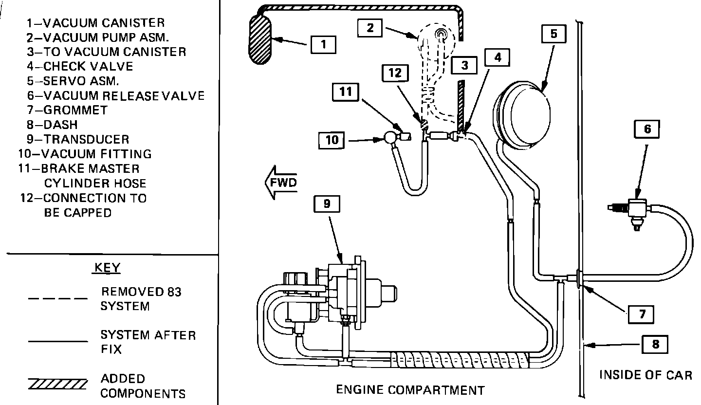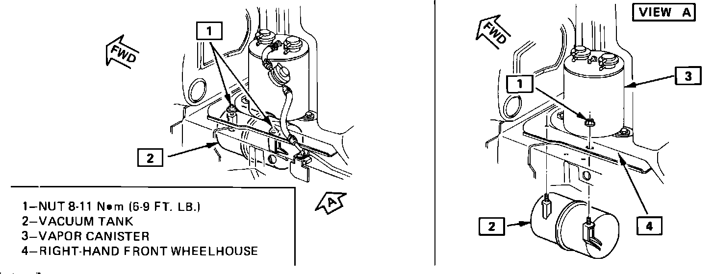 To correct the condition remove the vacuum pump and install cover, Part Number 10022599, and gasket, Part Number 9776705, using the existing bolts and washers. A vacuum tank, Part Number 14080255, must be installed using nuts, Part Number 11503747. The vacuum tank is installed below the vapor canister as shown in Figure 2. Six feet of 1/4" vacuum hose, one foot of