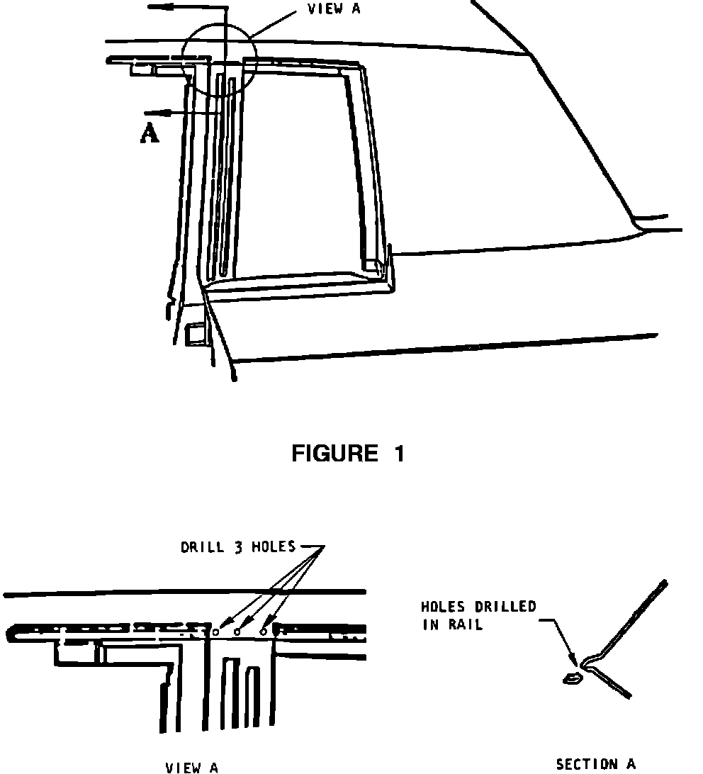 6. Drill three (3) 1/8" diameter holes through the remaining roof and side rail panels (Figure 1, View A, Section A).