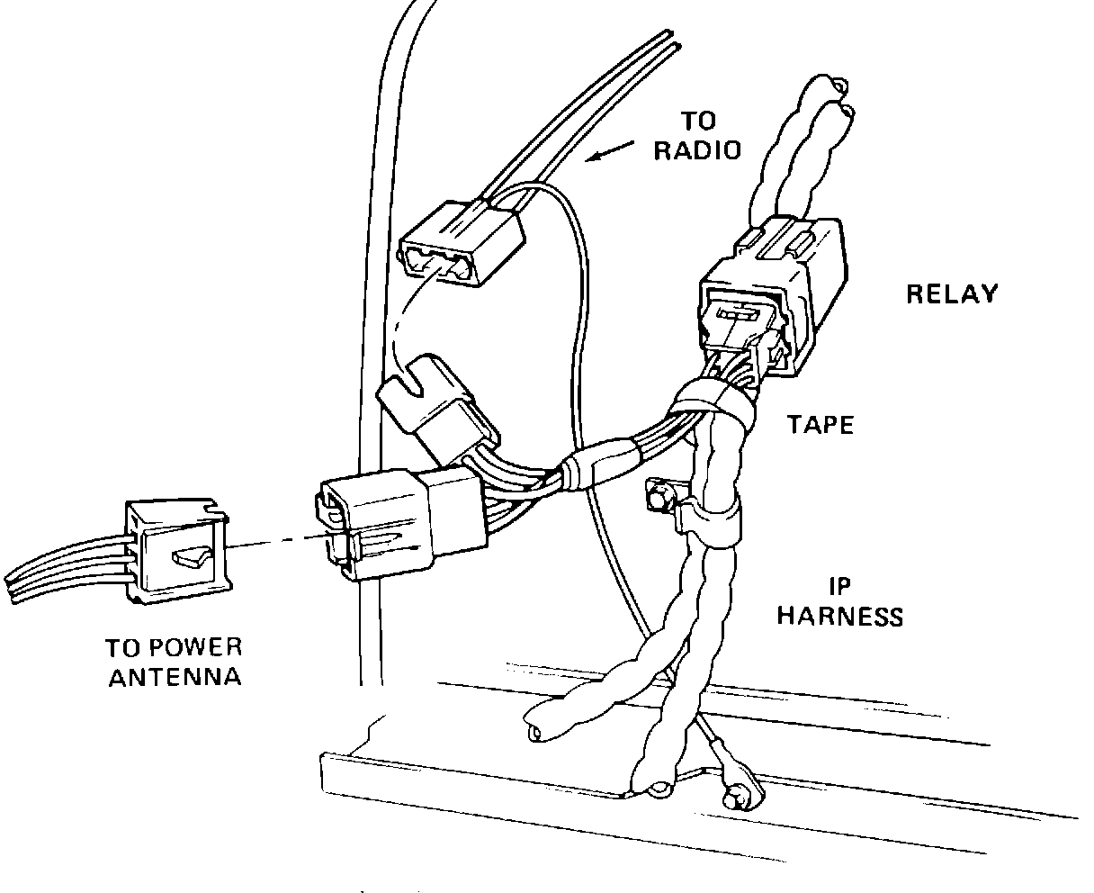 4. Plug one end of the jumper harness into the new relay, part no. 10030273 (2 connectors). Plug the other end onto the IP harness and the converted power antenna lead.