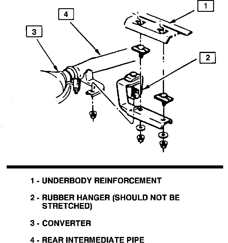 4. Check for an unrelaxed rubber exhaust hanger rearward of the catalytic converter (See Figure 4). The unrelaxed hanger will transmit vibration through the floor pan and body structure. If this condition exists, loosen the exhaust joint ball flange, reposition the catalytic converter upwards to unload the hanger and retighten the exhaust system flange bolts to 15-17 ft.lbs. or (20-24 N-m). Visual checks for exhaust system contacting the body should also be made.