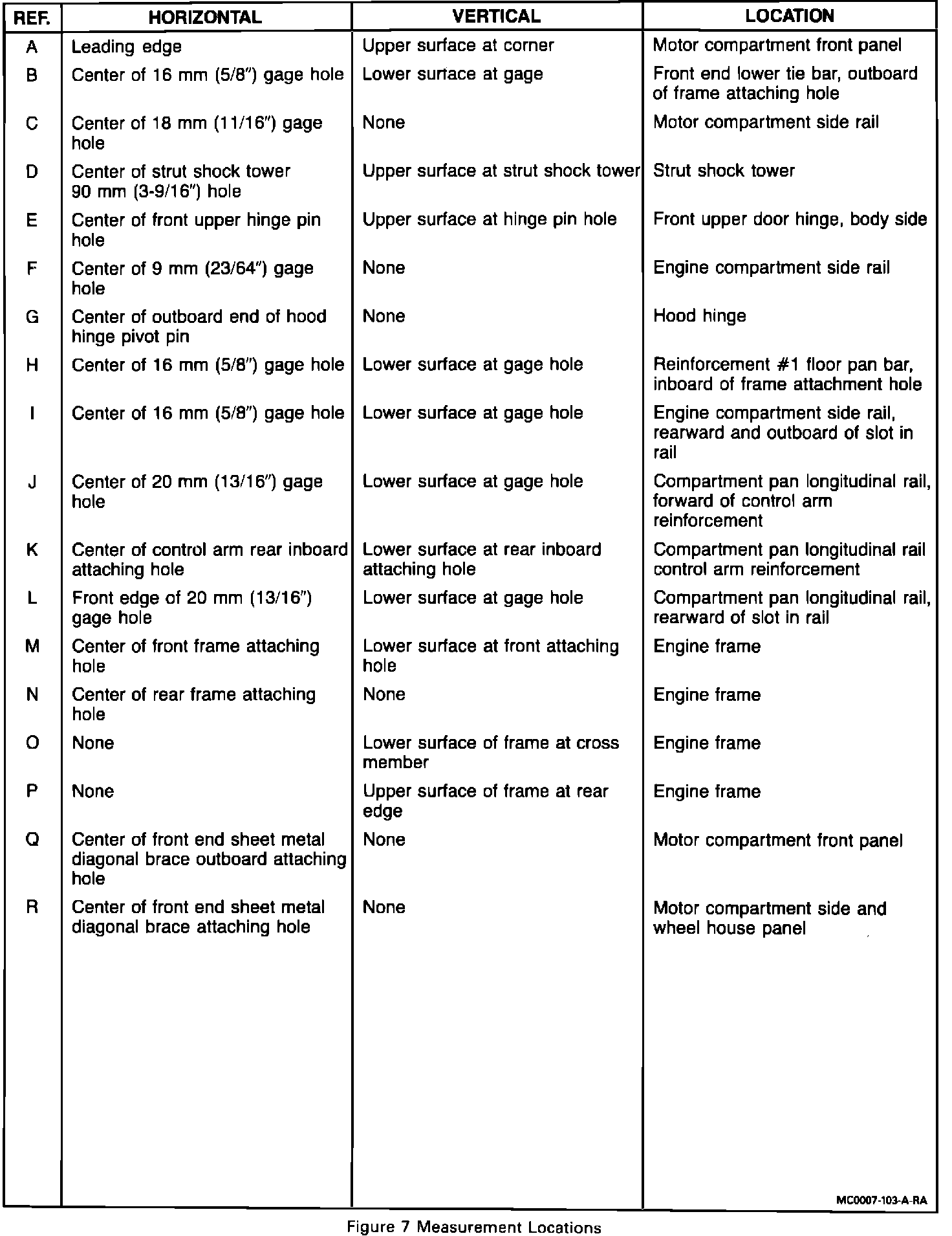 Due to a redesigned front fender wheelhouse panel, the body alignment dimensions and measurement locations at the strut towers have changed. Reference Point "D" has changed from the center of strut shock tower front attaching hole, to the center of the strut shock tower 90 mm (3-9/16") hole.