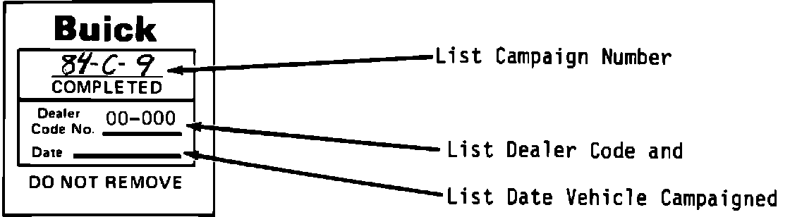 Each vehicle modified in accordance with the instructions outlined in this service procedure will require a Campaign Identification Label. Each label provides a space to include the campaign number, the five (5) digit dealer code of the dealer performing the campaign service, and the date vehicle was campaigned. This information may be inserted with a typewriter or ballpoint pen. When installing label, clean the surface of the radiator baffle and apply the campaign label where it is readily visible.