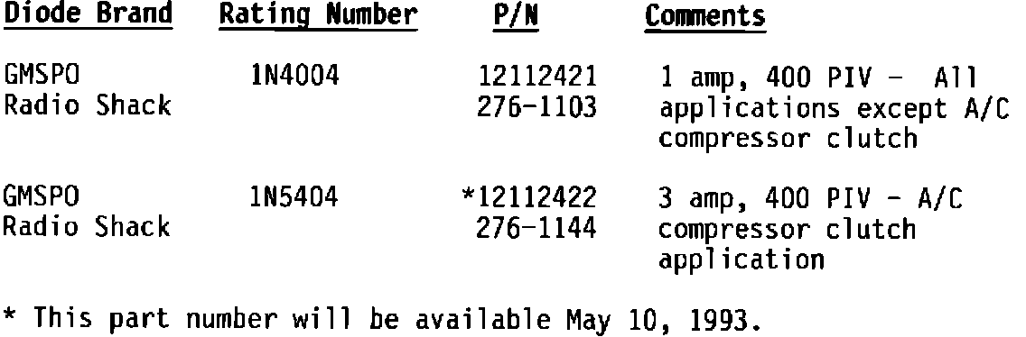 Obtaining replacement diodes can sometimes be a problem. A universal diode, that meets the specifications in the chart, may be used for the applications listed above. Since certain diode applications have specific part numbers, always reference the applicable GM parts catalogue before installing one of the universal diodes listed in this bulletin.