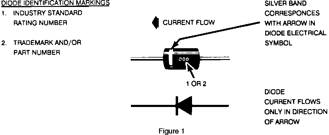 4. Check current flow direction of the new diode, being sure to install the diode with correct bias. Reference the appropriate service manual wiring schematic to obtain the correct diode installation position. Reference Figure 1 for replacement diode symbols and current flow explanations.