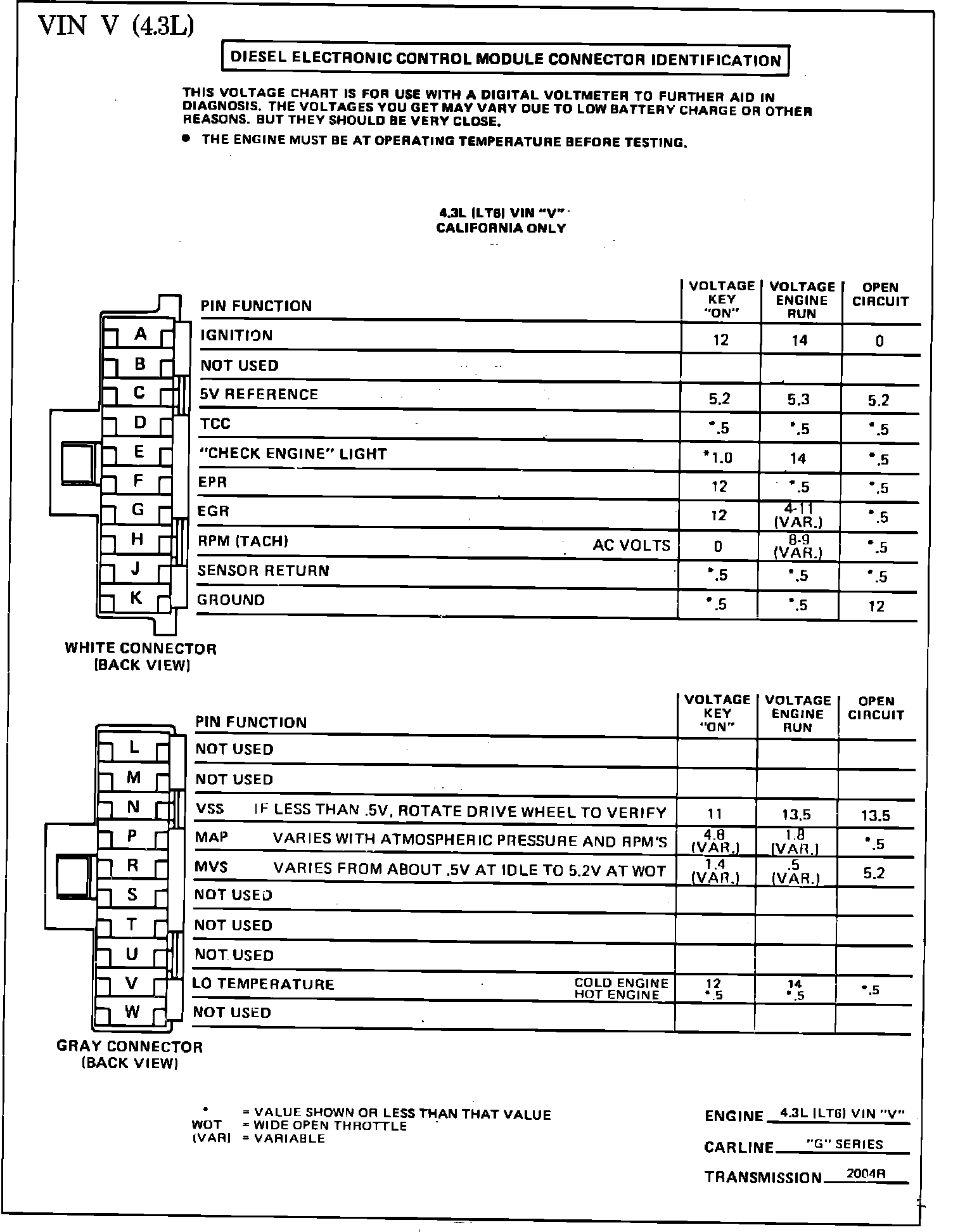 Fig. 077 - ECM Connector Terminal Identification & Voltage Specifications: